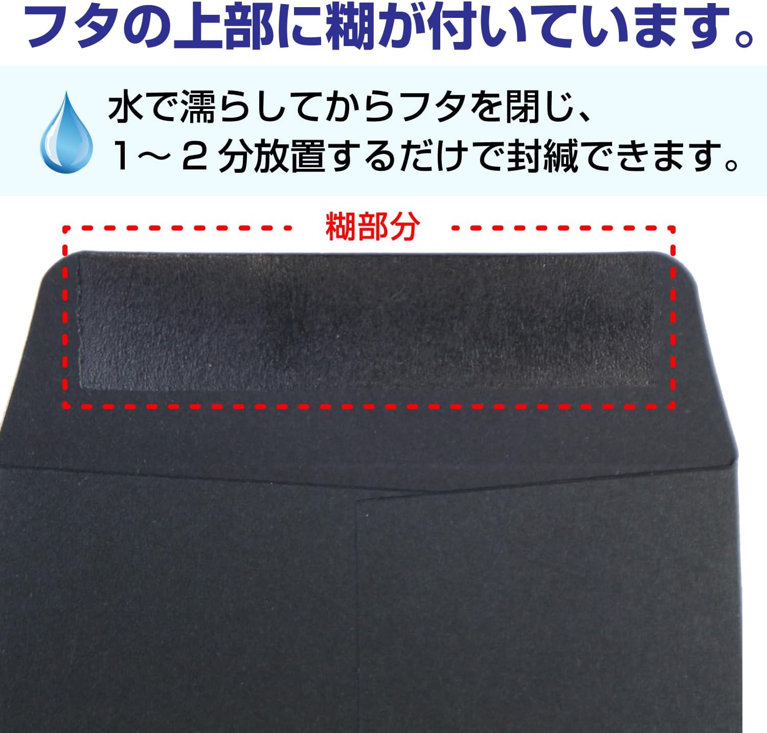フタの上部に糊が付いているため、水で濡らしてからフタを閉じ、1~2分放置するだけで封緘できます。