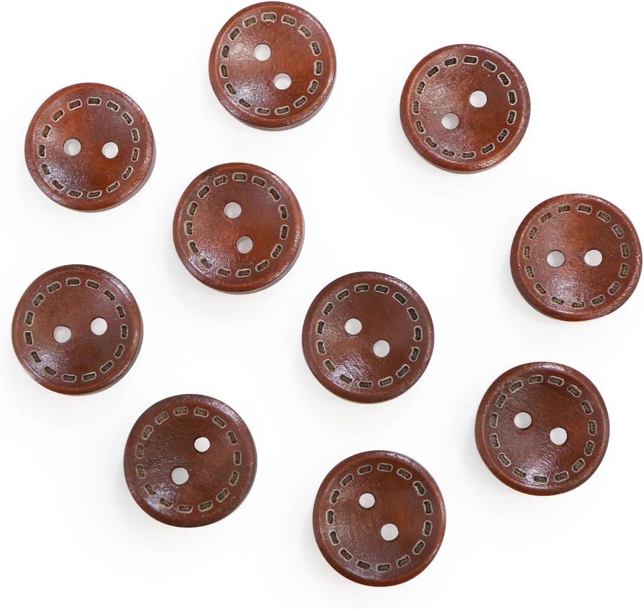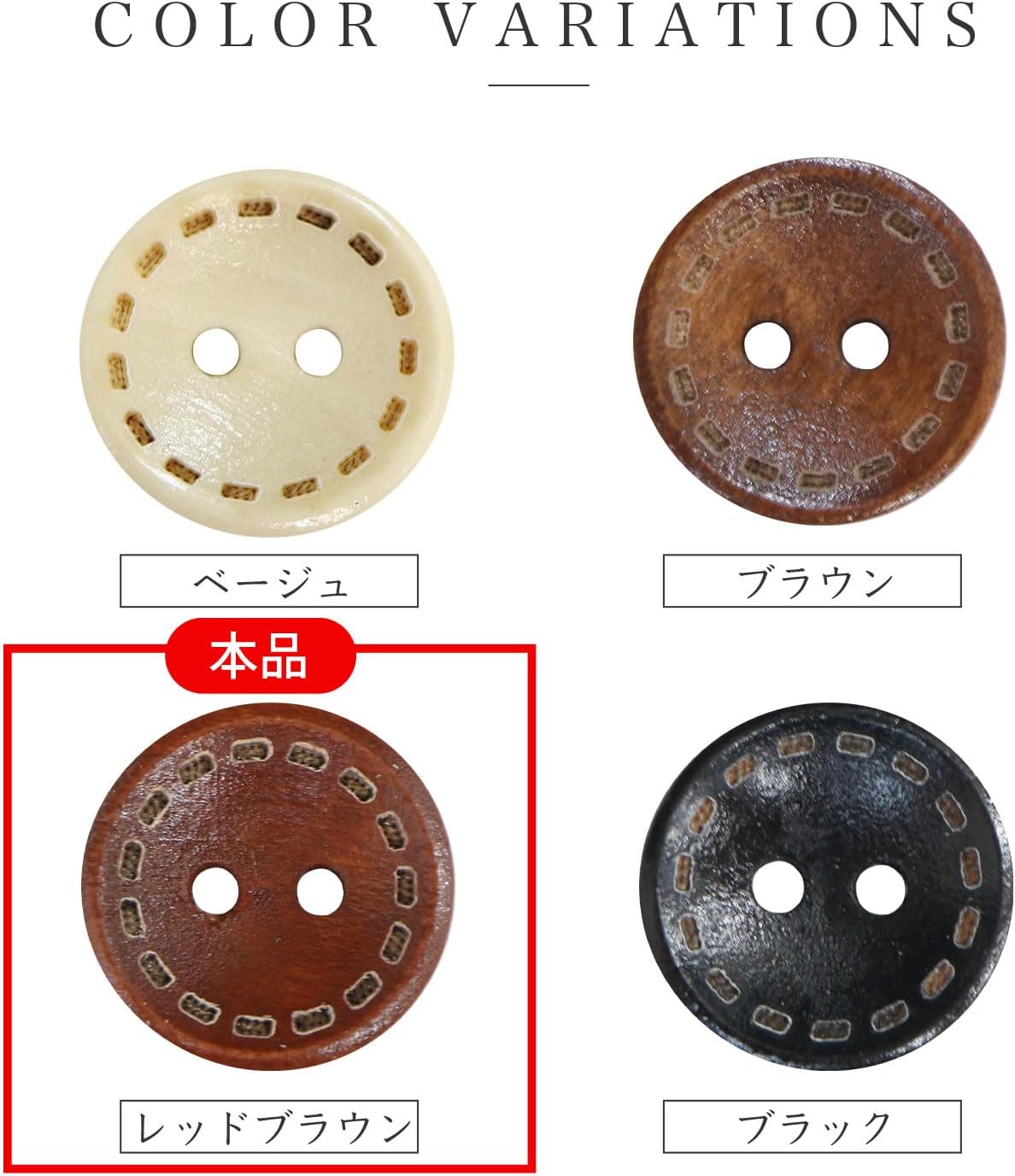 温もりのある木の風合いと、ステッチ風の点線模様が魅力の二つ穴ボタンです。