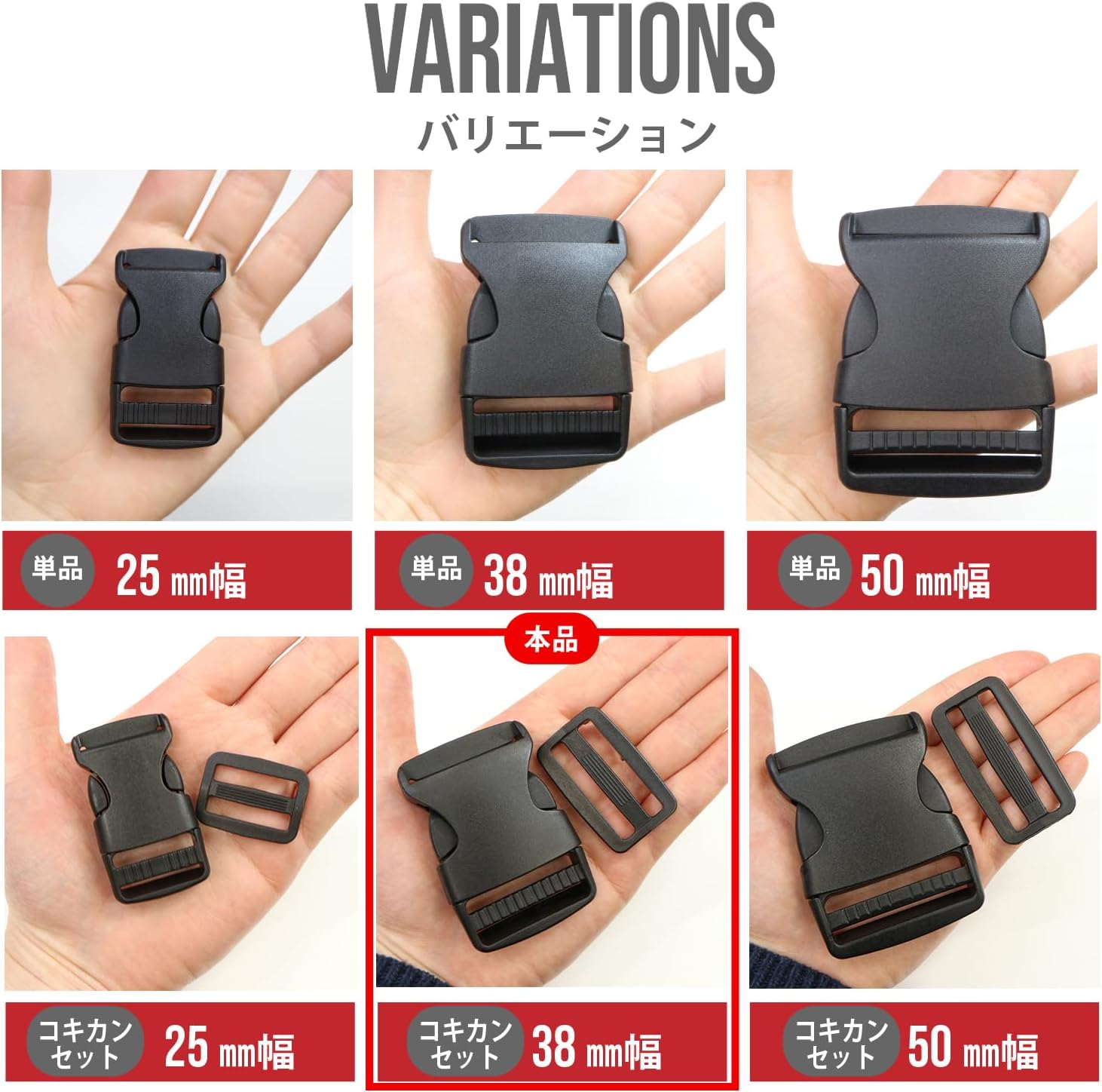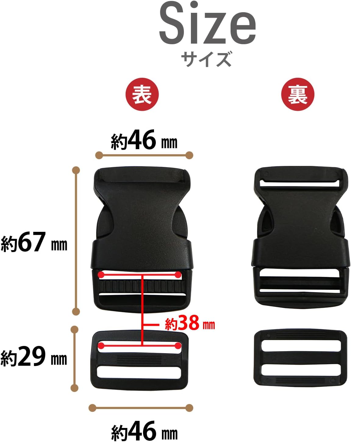 【セット内容】バックル2個、コキカン4個 【対応サイズ】約38mm 【バックルサイズ】約46x67mm 【コキカンサイズ】約46x29mm