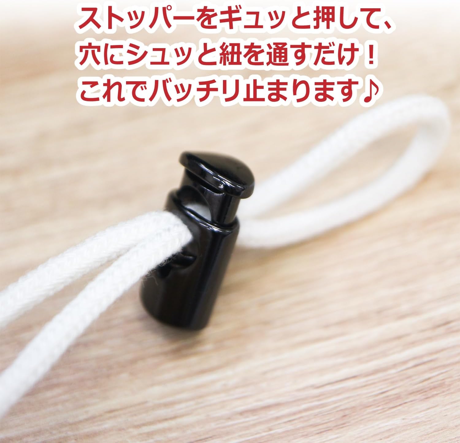 ストッパーを押してできた穴に紐を通すだけで簡単に取り付けられ、しっかりと固定できます。