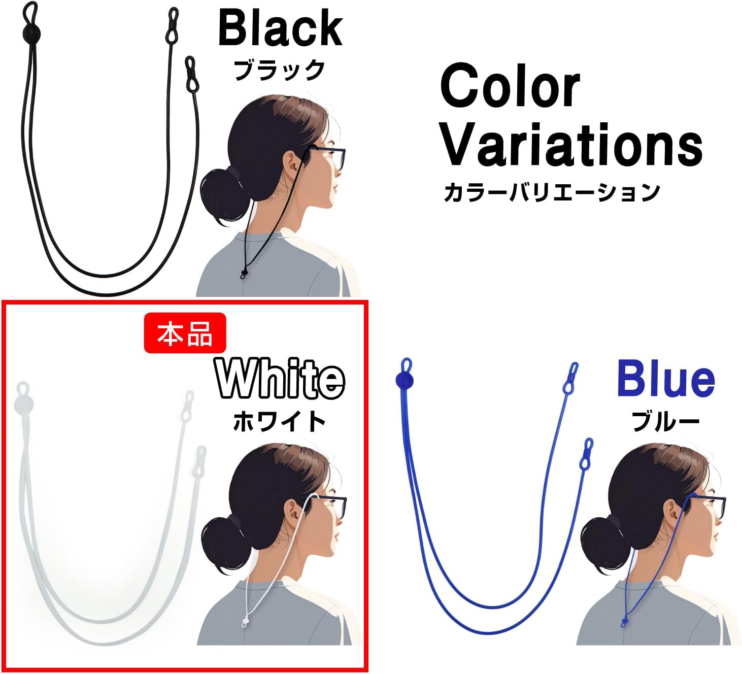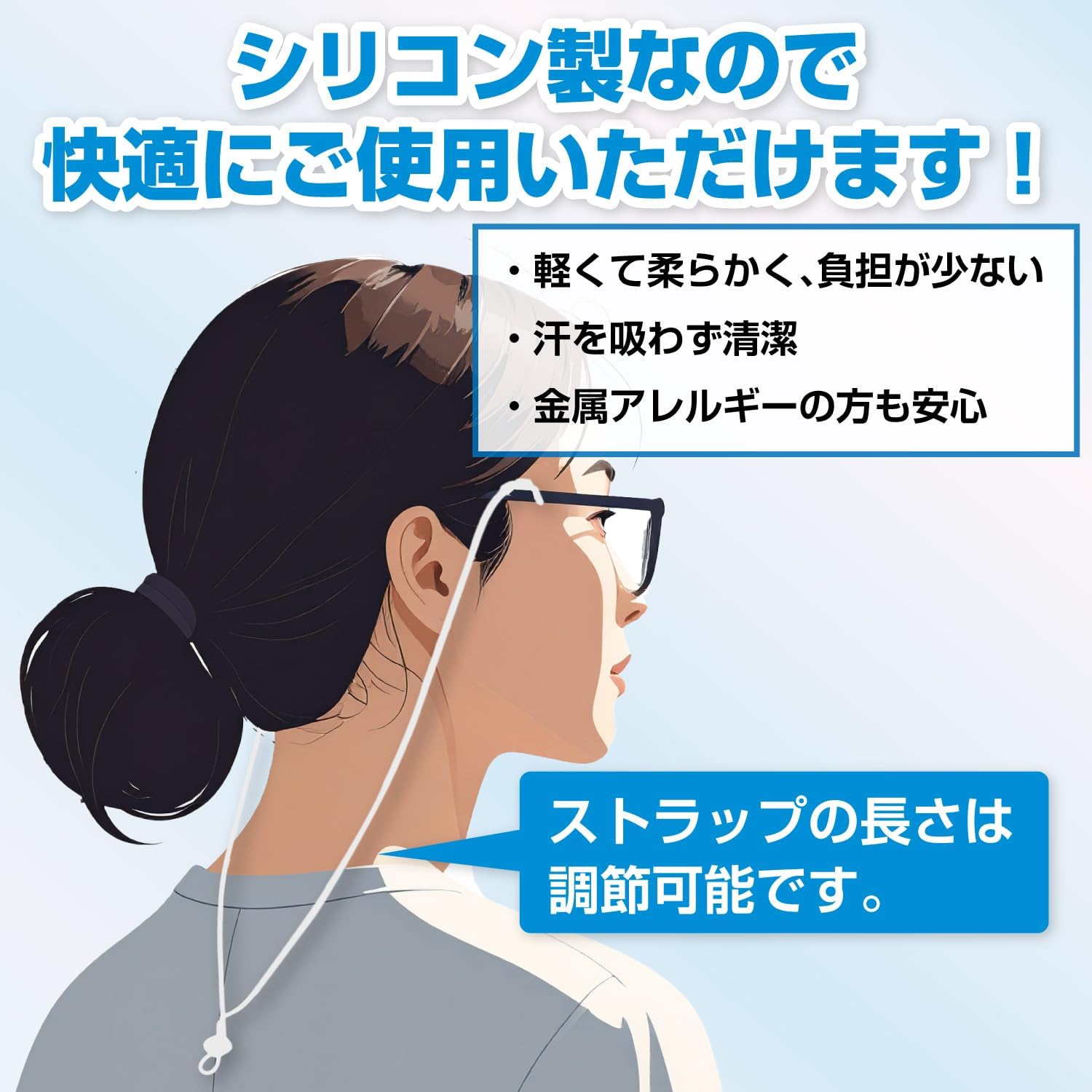 【特徴】軽量で柔らかいため、装着時の負担が少ないメガネストラップです。ツマミ部分をスライドすることで、長さを調節できます。