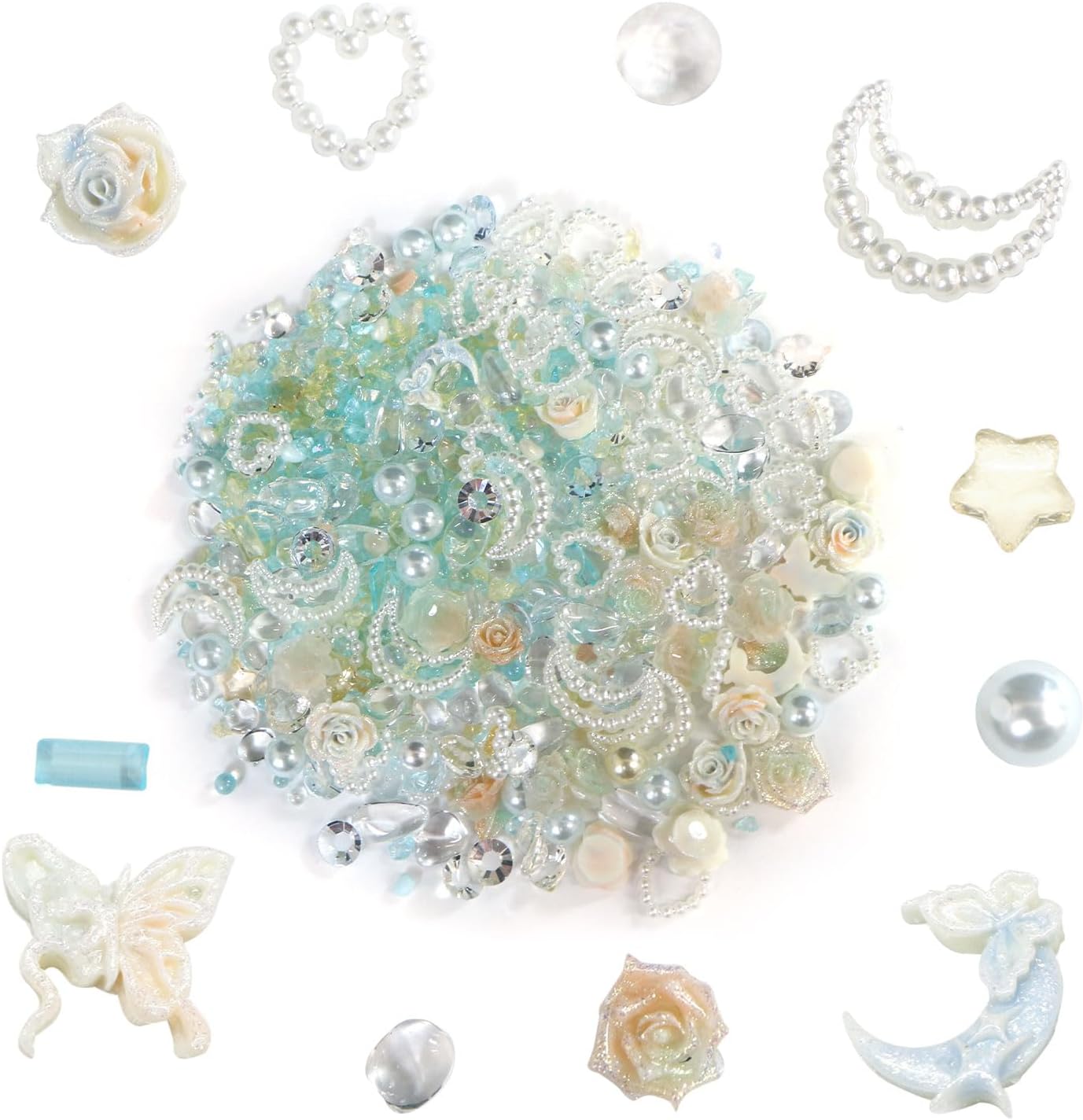 透明感のあるクリアパーツや繊細なパール、きらめくラインストーンなどがバランスよくミックスされており、スマホケースやミラー、アクセサリーなどのデコレーションはもちろん、ネイルアートやレジン作品づくりなど幅広くお使いいただけます。